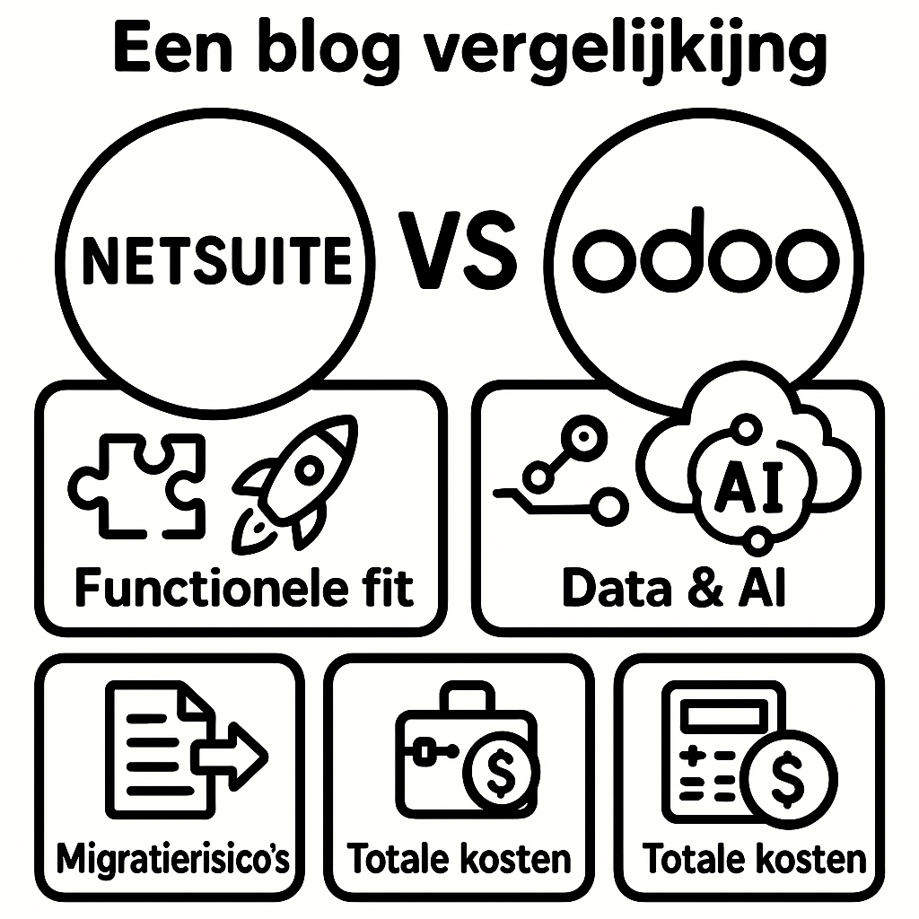 Deze blog vergelijkt NetSuite en Odoo als kern-ERP langs functionele fit, strategische wendbaarheid, data & AI, migratierisico’s en totale kosten. NetSuite scoort sterk bij multi-entity, consolidatie en SaaS-governance; Odoo bij modulariteit, time-to-change en hostingkeuze. Inclusief integratie-, datamigratie- en TCO-scenario’s en praktische vervolgstappen.
